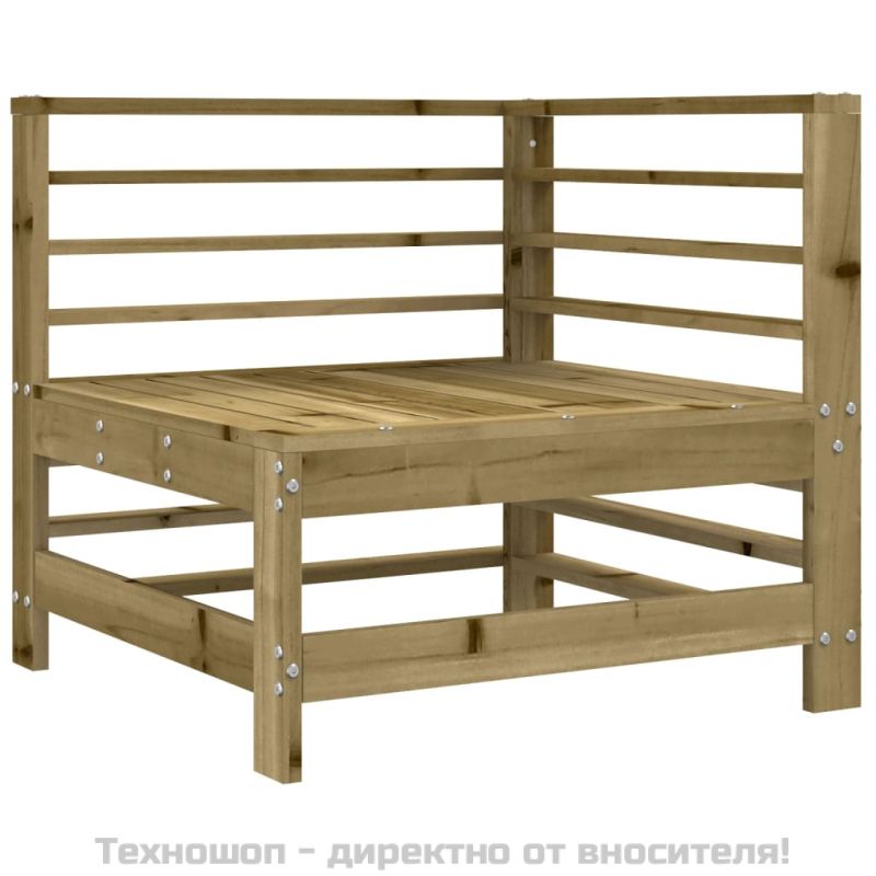 Този дървен ъглов диван, който се отличава с дизайн на летви и меки възглавници, ще бъде чудесно допълнение към вашата градина, вътрешен двор или тераса, за да се насладите на уютно време със семейството или приятелите си. Импрегнирана дървесина: Масивната борова дървесина е красив естествен материал. Боровата дървесина е с продълговати шарки, а чеповете придават на материала характерния му рустик вид. Импрегнирането е процес на запазване, който се извършва с помощта на автоклави. Обработката под налягане повишава устойчивостта на гниене и атмосферни влияния.Здрава и стабилна рамка: Дървените рамки правят градинския диван здрав и стабилен за ежедневна употреба на открито.Удобно седене: Облегалката добавя повече комфорт при седене на дивана за открито. Освен това дебело подплатената възглавница осигурява комфорт по време на седене.Модулен дизайн: Секционният диван е гъвкав и лесен за преместване. Можете да го комбинирате с други модулни сегменти в уеб магазина, за да създадете свои лични конфигурации на градински лаундж комплект! Добре е да се знае:За да сте сигурни, че вашите външни мебели ще останат красиви, ви препоръчваме да ги защитите с водоустойчиво покривало. Максимално 110 кг на седалка.