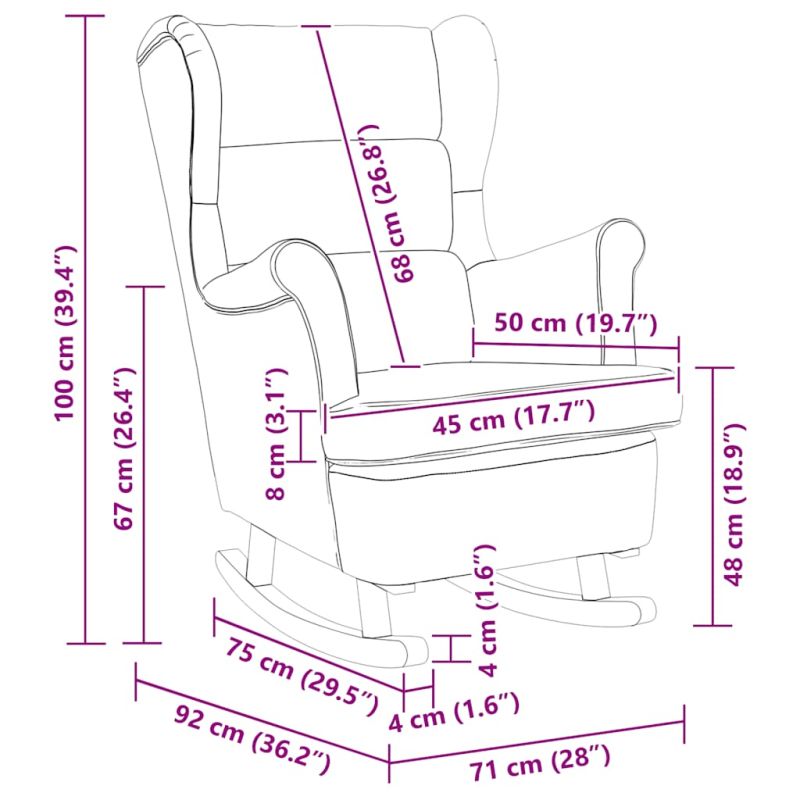 Този люлеещ се стол е чудесна комбинация от стилен дизайн и функционалност. Съчетанието от качествена изработка и материали превръща нашия направен по мярка фотьойл в съществена част от декора на вашия дом. Благодарение на дебело подплатената му пяна, тапицирана с меко на допир кадифе, можете да се насладите на оптимален комфорт по време на седене. В допълнение, този стол за всекидневна се поддържа от люлеещи се крака от каучуково дърво масив, които гарантират допълнителна стабилност.
