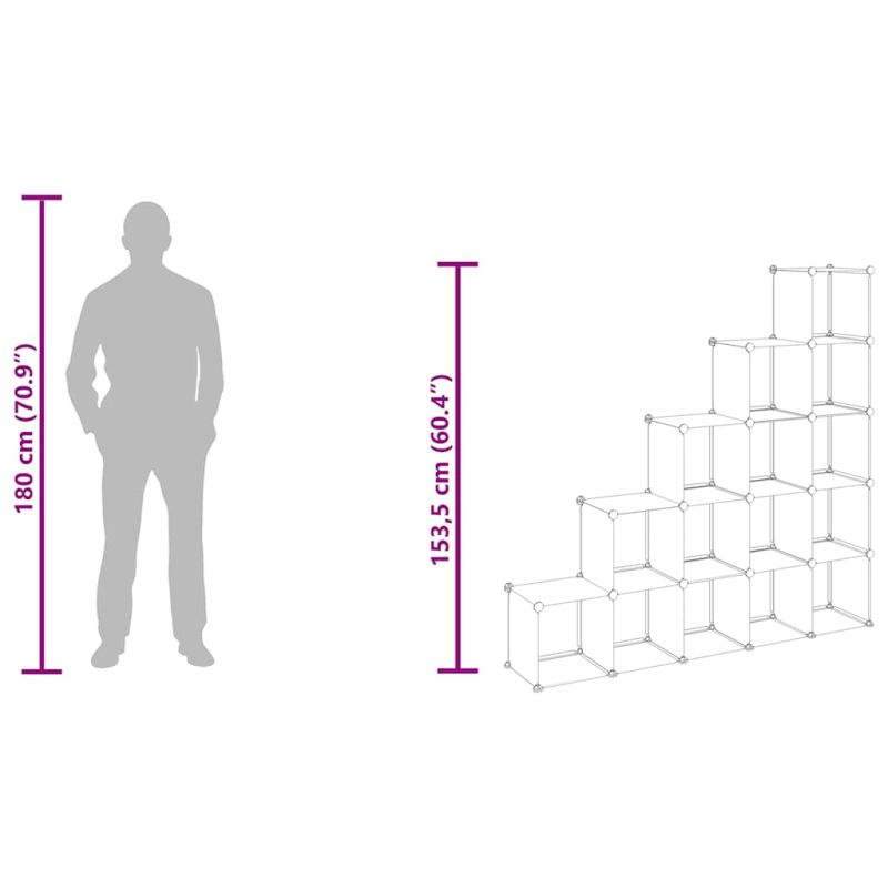 Този универсален органайзер с отделения във формата на куб е предназначен да използва по най-добрия начин ограниченото пространство и да задоволи различните ви нужди за съхранение. Практичен материал: Органайзерът за съхранение е изработен от PP пластмасови панели, които са водоустойчиви и се нуждаят от малко поддръжка.Здрава и стабилна структура: Стоманените рамки осигуряват здравина и стабилност.Дизайн, удобен за употреба: Благодарение на олекотения дизайн, рафтът за съхранение може да се сглоби по ваш вкус с включения дървен чук. Когато не се използва, е лесно да отделите панелите и да ги подредите един върху друг, за да спестите място.Достатъчно място за съхранение: Този пластмасов шкаф съдържа 15 модулни кубчета. Мястото за съхранение улеснява подреждането на вещите.Широко приложение: С голямо пространство за съхранение и семпъл дизайн, стелажът за съхранение е отлично решение за съхранение за вашия дом, общежитие и офис. Забележка:Максималната товароносимост на всеки куб е 10 кг.