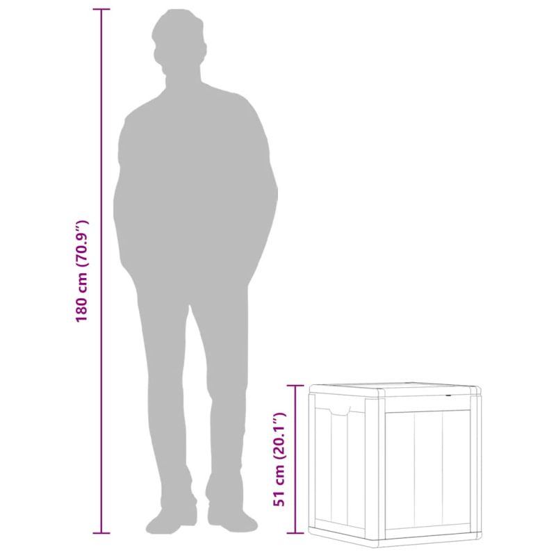 Този семпъл сандък за съхранение е отлично решение за съхранение на вашите вещи от градината, вътрешния двор или терасата. Сандъкът за съхранение е изработен от 100% PP материал, което го прави устойчив на атмосферни влияния и UV лъчи, лек и лесен за местене. Градинската кутия за съхранение се отличава с изчистен класически дизайн и се съчетава перфектно с вашия вътрешен и външен декор. В допълнение, тя предоставя достатъчно място за съхранение на големи или декоративни възглавници, домакински уреди или градински инструменти, които да са ви подръка. Забележка: За да удължите живота на вашите градински мебели, препоръчваме ви да ги почиствате редовно и да не ги оставяте ненужно на открито без защита.Почистване: Използвайте мек сапунен разтвор.Съхраняване: Ако е възможно, съхранявайте на хладно и сухо място на закрито. Ако продуктът се съхранява на открито, защитете го с водоустойчиво покривало. Избършете и изсушете излишната вода или сняг от плоските повърхности след дъжд или снеговалеж. Позволете достатъчно циркулация на въздуха, за да избегнете повреди, свързани с влагата.