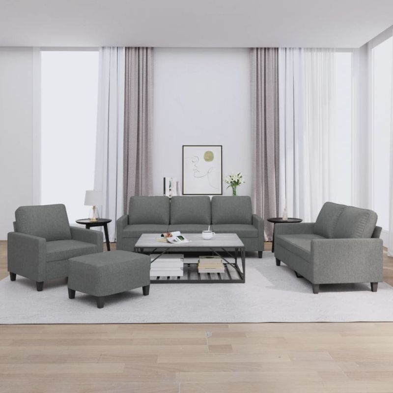 Този комплект дивани е отлично място за вашето време за разговори, четене, гледане на телевизия или просто почивка. Той е предназначен да бъде фокусна точка във вашия дом. Издръжлив текстил: Материята се отличава със семпъл и изчистен вид, като същевременно остава дишаща и дълготрайна.Здрава и стабилна рамка: Шперплатът и металната рамка на седалката на дивана осигуряват здравина и стабилност.Удобна седалка: Диванът е много удобен с дебело подплатената седалка, подлакътниците и възглавницата за гърба.Функционална табуретка: Табуретката е подходяща за повдигане за крака, когато лежите на диван, или ви предлага допълнително място за сядане във вашата стая. Освен това семплият дизайн и компактният размер я правят идеална за сядане почти навсякъде в жилищното ви пространство. Максимално 110 кг на седалка. Съобразете се с риска от открит огън и други източници на силна топлина в близост до продукта.