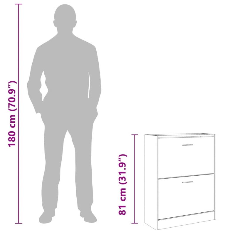 Този шкаф за обувки с модерен и стилен дизайн е отлична мебел за организирано съхранение на вашите обувки. Подходящ е за антре, фоайе, хол, спалня и други места, където желаете да го поставите. Издържлив материал: Инженерната дървесина е с изключително качество с гладка повърхност и също така се отличава със здравина, стабилност и устойчивост на влага.Достатъчно място за съхранение: Тази етажерка за обувки разполага с 2 чекмеджета, осигуряващи достатъчно място, където да държите обувките си подръка и добре подредени.Дизайн с падащо чекмедже: Със своя дизайн с падащо чекмедже този шкаф за обувки се отваря и затваря лесно. Забележка:Всеки продукт се доставя с ръководство за сглобяване в кашона за лесно сглобяване. Внимание:За да се предотврати преобръщане, този продукт трябва да се използва с предоставената приставка за стена