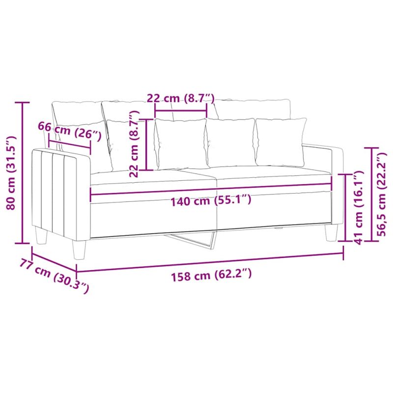 Този 2-местен диван е отлично място за вашето време за разговори, четене, гледане на телевизия или просто почивка. Той е предназначен да бъде фокусна точка във вашия дом. Издръжлив текстил: Материята се отличава със семпъл и изчистен вид, като същевременно остава дишаща и дълготрайна.Здрава и стабилна рамка: Металната рамка на тапицирания диван осигурява здравина и стабилност.Удобна седалка: Диванът е много удобен с дебело подплатените седалки, подлакътниците и възглавниците за гърба.Привличащ вниманието дизайн: С изчистен, но модерен дизайн, това канапе е предназначено да привлича вниманието във вашата стая.