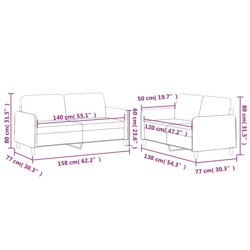 Този комплект дивани е отлично място за вашето време за разговори, четене, гледане на телевизия или просто почивка. Той е предназначен да бъде фокусна точка във вашия дом. Издръжлив текстил: Материята се отличава със семпъл и изчистен вид, като същевременно остава дишаща и дълготрайна.Здрава и стабилна рамка: Шперплатът и металната рамка на седалката на дивана осигуряват здравина и стабилност.Удобна седалка: Диванът е много удобен с дебело подплатената седалка, подлакътници и възглавници за гърба.