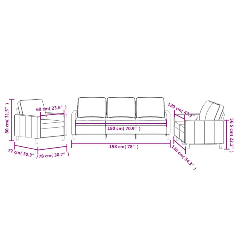 Този комплект дивани е отлично място за вашето време за разговори, четене, гледане на телевизия или просто почивка. Той е предназначен да бъде фокусна точка във вашия дом. Меко кадифе: Кадифето е мека и удобна материя, която се усеща приятно върху кожата.Здрава и стабилна рамка: Шперплатът и металната рамка на седалката на дивана осигуряват здравина и стабилност.Удобна седалка: Диванът е много удобен с дебело подплатената седалка и подлакътници.