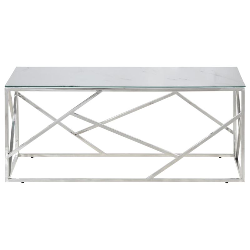 Комбинирайки функционалност и красота, тази масичка за кафе ще бъде централната точка на вашата стая. Стъклен плот с бял мраморен финиш: Плотът на страничната масичка предлага сигурна и достатъчна повърхност за поставяне на закуски, напитки, вази, купи за плодове или други декоративни елементи. Здрава и стабилна рамка: Рамката от неръждаема стомана на холната маса осигурява здравина и стабилност. Лесна поддръжка: Тази акцентна маса с устойчива на петна повърхност е лесна за почистване и можете безпроблемно да поддържате масата в най-добрия ѝ вид. Семпъл дизайн: Тази холна маса има семпъл и модерен дизайн, който допълва интериора във всяка стая.