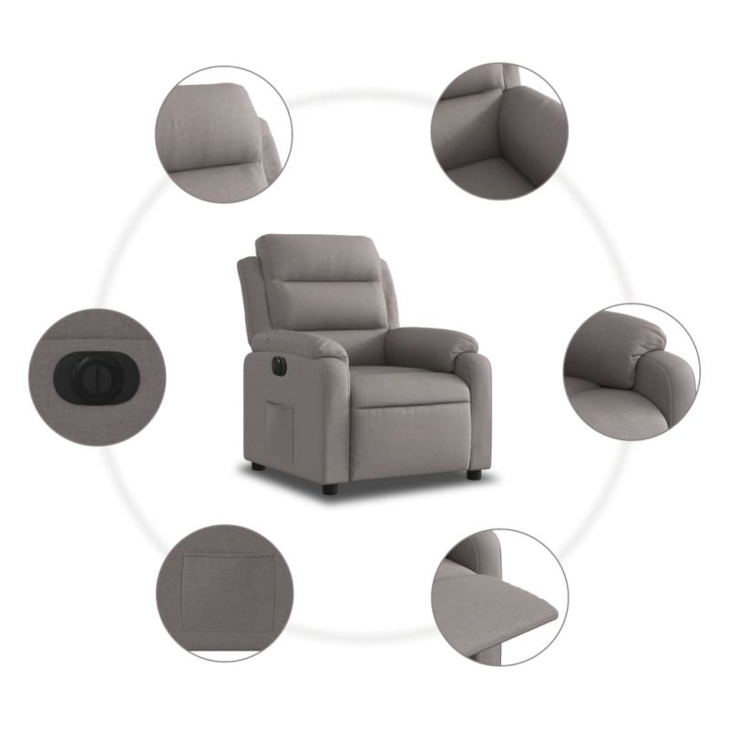 Облегнете се и се отпуснете в този изключително комфортен електрически наклоняем стол! Електрическа функция за накланяне: Този стол с облегалка е оборудван с електрически мотор, който помага автоматично да регулирате поставката за крака и облегалката до произволна позиция според вашето удобство с просто натискане на бутона отстрани на стола. Тази функция позволява максимален наклон от 135 градуса. Освен това облегалката може да се върне автоматично на първоначалното си място с лесно натискане на бутона.Удобно седене: Дебело подплатената седалка, облегалка и широки подлакътници, покрити с текстил, осигуряват уютно и топло усещане, което ви кара да се чувствате като в прегръдка, докато седите. Тъканта се отличава със семпъл и изчистен вид и е дишаща и издръжлива.Удобен страничен джоб: Този фотьойл има страничен джоб, за да държите основните си вещи леснодостъпни.Здрава и стабилна рамка: Рамката, изработена от дърво и метал, осигурява здрава структура и стабилност. Този накланящ се фотьойл е удобен и издръжлив. Максимално 110 кг на седалка.Този уред може да се използва от деца на възраст от 8 години и повече и от лица с намалени физически, сетивни или умствени способности или с липса на опит и познания, ако са получили надзор или инструкции за безопасно използване на уреда и разбират свързаните с него опасности. Децата не трябва да си играят с уреда. Децата не трябва да почистват и да извършват потребителска поддръжка без надзор.