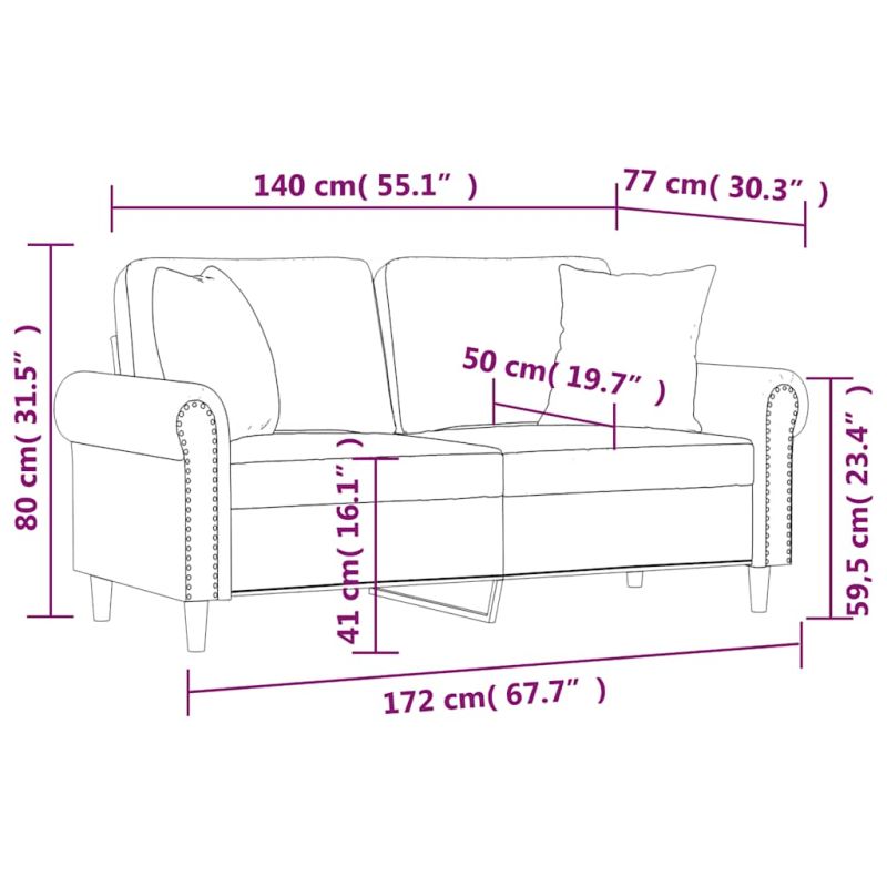 Този 2-местен диван, който се отличава с модерен дизайн и декоративни възглавници, ще бъде отлично място за разговори, гледане на телевизия или просто почивка. Издържлива изкуствена кожа: Първокласната изкуствена кожа е изключително издръжлив материал. Устойчива е на петна, което я прави лесна за почистване с влажна кърпа. Гладката повърхност също така придава луксозен вид и красотата на истинската кожа.Здрава и стабилна рамка: Металната рамка на тази мека мебел осигурява здравина и стабилност.Декоративни възглавници с вложки: Тези възглавници за диван се предлагат с памучни PP вложки, така че не е необходимо да купувате пълнеж.Удобна седалка: Диванът е много удобен с дебело подплатените седалки, подлакътниците и възглавниците за гърба. Освен това декоративните възглавници могат да добавят допълнителен комфорт, когато сте седнали или легнали.
