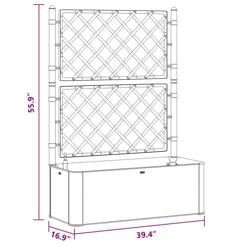 Създайте прекрасен фон за вашите цветя с елегантно, функционално и уникално самополивно повдигнато легло! Това сандъче с решетка е снабдено с голяма цветна кутия, която може да побере голям брой зелени растения и цветя. Вградената решетка предлага отлична опора за увивни растения, като билки, домати, боб и др. Изработена от здрава пластмаса, устойчива на UV лъчи, атмосферни влияния и замръзване, тя е подходяща за използване като на закрито, така и на открито. Дизайнът прилича на истинска структура от ратан. Материалът се пере и се почиства лесно. Освен това този сандък може автоматично да полива растенията, като отделя влага от своя резервоар за вода с капацитет 90 л и има отвори за преливане, предотвратяващи преполиването. Включен е индикатор за нивото на водата.