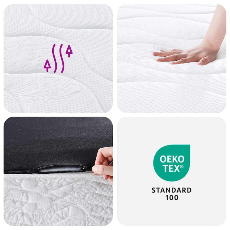 Този матрак с бонел пружини е проектиран да ви осигури приятно усещане и комфортен сън у дома. Издръжливост и дълготрайност: Материята се отличава със семпъл и изчистен вид, като същевременно остава дишаща, удобна за кожата и дълготрайна. Отлична опора: Пружинната бонел система се състои от взаимосвързани стоманени спирали с форма на пясъчен часовник, които са твърди и стабилни, осигурявайки поддържаща и издръжлива основа за матрака. Подобрен комфорт: Пружинният матрак е проектиран с множество слоеве, включително слой от пяна, слой изолираща подложка и слой пружина. Тази комбинация осигурява меко до средно меко усещане и люлеещ комфорт за всички позиции за сън. Освен това матракът ефективно абсорбира шума и вибрациите, причинени от мятане и въртене, осигурявайки спокоен и необезпокояван сън. Лесна поддръжка: Пружинният матрак с пяна има дълъг цип в долната част, който улеснява свалянето на калъфа за почистване. Добре е да се знае:Този матрак е съставен от две отделни ядра, които са обединени в един общ матрак.Калъфът на матрака може да се пере до 40 °C. Моля, не го перете твърде често. За ваше удобство матракът е компресиран и навит в кутия, като лесно можете да го местите и поставяте във вашата стая.
