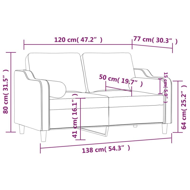 Този 2-местен диван, който се отличава с модерен дизайн и декоративни възглавници, ще бъде отлично място за разговори, гледане на телевизия или просто почивка. Издръжлив текстил: Материята се отличава със семпъл и изчистен вид, като същевременно остава дишаща и дълготрайна.Здрава и стабилна рамка: Металната рамка на тази мека мебел осигурява здравина и стабилност.Свалящи се калъфки за възглавници: Затварянето с цип позволява калъфките на тези възглавници лесни да бъдат свалени и изпрани, когато е необходимо.Удобна седалка: Диванът е много удобен с дебело подплатените седалки, подлакътниците и възглавниците за гърба. Освен това декоративните възглавници могат да добавят допълнителен комфорт, когато сте седнали или легнали.