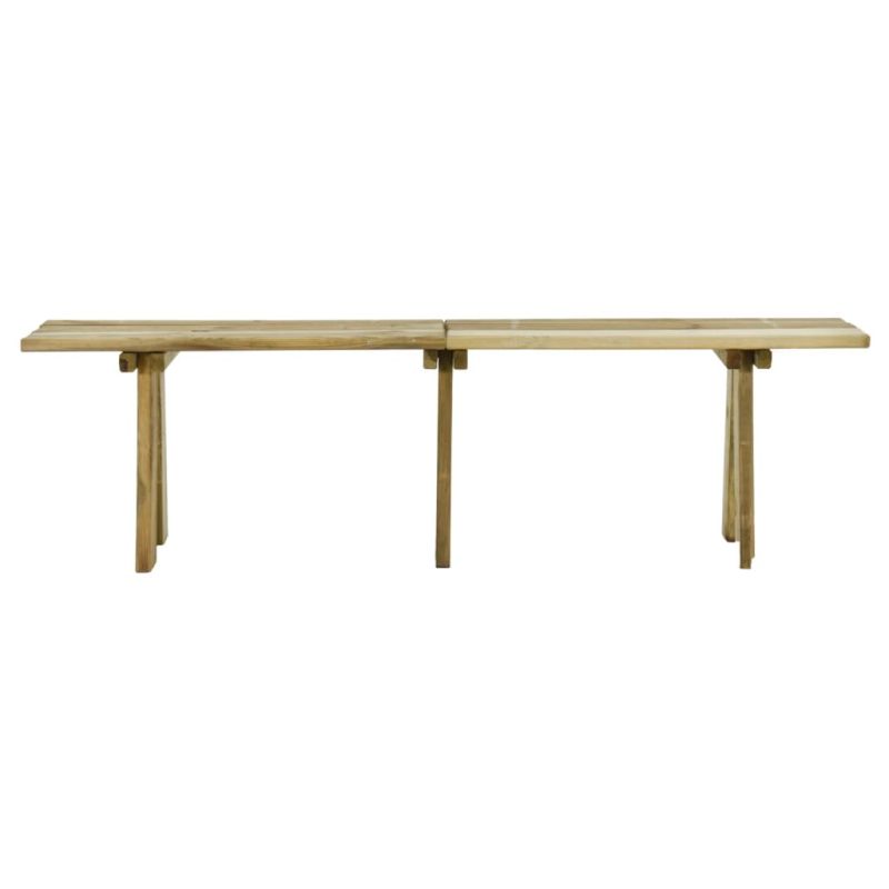 Тази дървена градинска пейка е идеалният избор за отдих и наслада на свободното ви време на открито с приятели или семейството ви. Изработена е от импрегнирана борова дървесина, което я прави издръжлива и устойчива на корозия. Следователно градинската пейка е подходяща за използване на открито. Със сигурност ще се насладите на свободното си време на тази пейка във вътрешния двор! Забележка: За да удължите живота на вашите градински мебели, ви препоръчваме да ги защитите с водоустойчиво покритие.