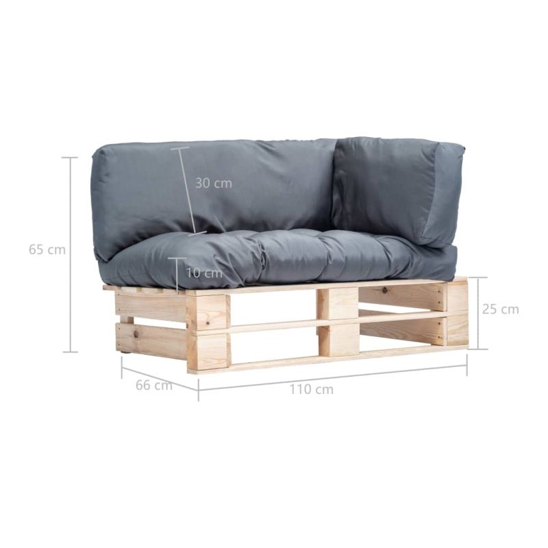 Градински палетен диван със сиви възглавници, борово дърво
