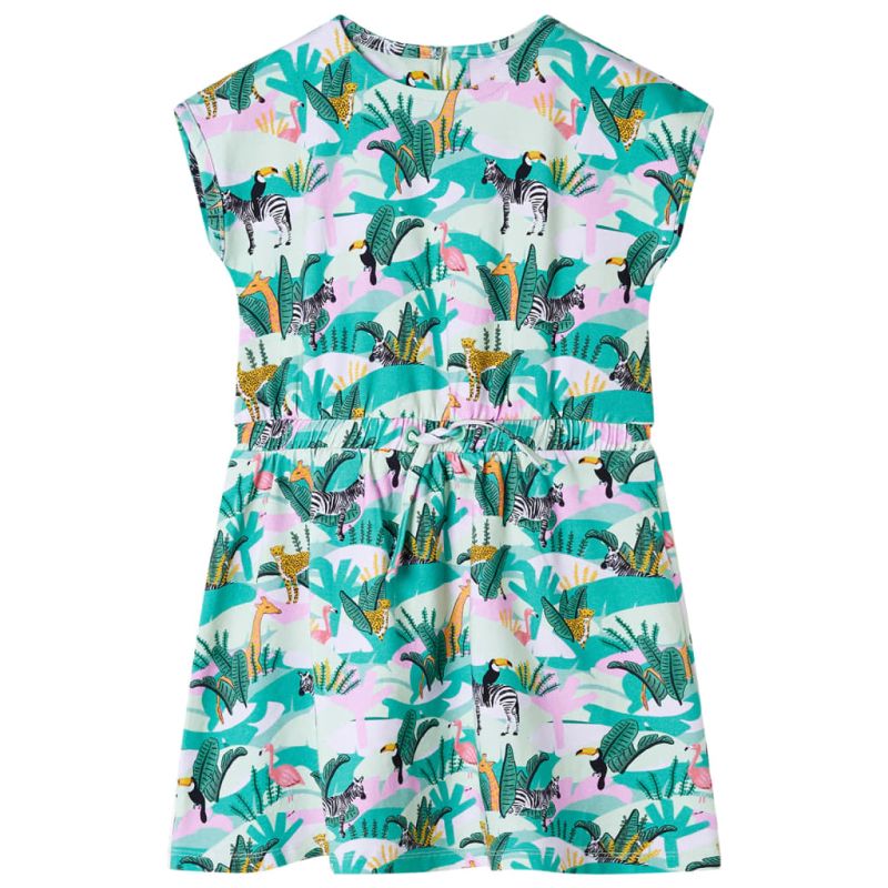 Нашата линия за детски дрехи е за достъпни, висококачествени и издръжливи ежедневни облекла за деца на възраст от 1,5 до 10 години. Нашата гама включва якета, пуловери, ризи и много други, с разнообразие от стилове, размери и цветове. Следвайки стандарта за високо качество на пазара, ние използваме висококачествени материали и усъвършенствани производствени техники. Тази детска рокля е с обло деколте, ръкави капачета, ластик на талията с шнур и се закопчава с копче на врата. Тази детска рокля е изпъстрена с животни и растения навсякъде. Детската къса рокля е изработена от мека материя, която включва 92% памук и 8% еластан за комфорт и дишане. Добре е да знаете: Таблицата с размери на снимката предоставя размери за деца на възраст от 1,5 до 10 години, като обхваща височината, гърдите, талията и ханша. Лесно можете да намерите подходящата за вашето дете.