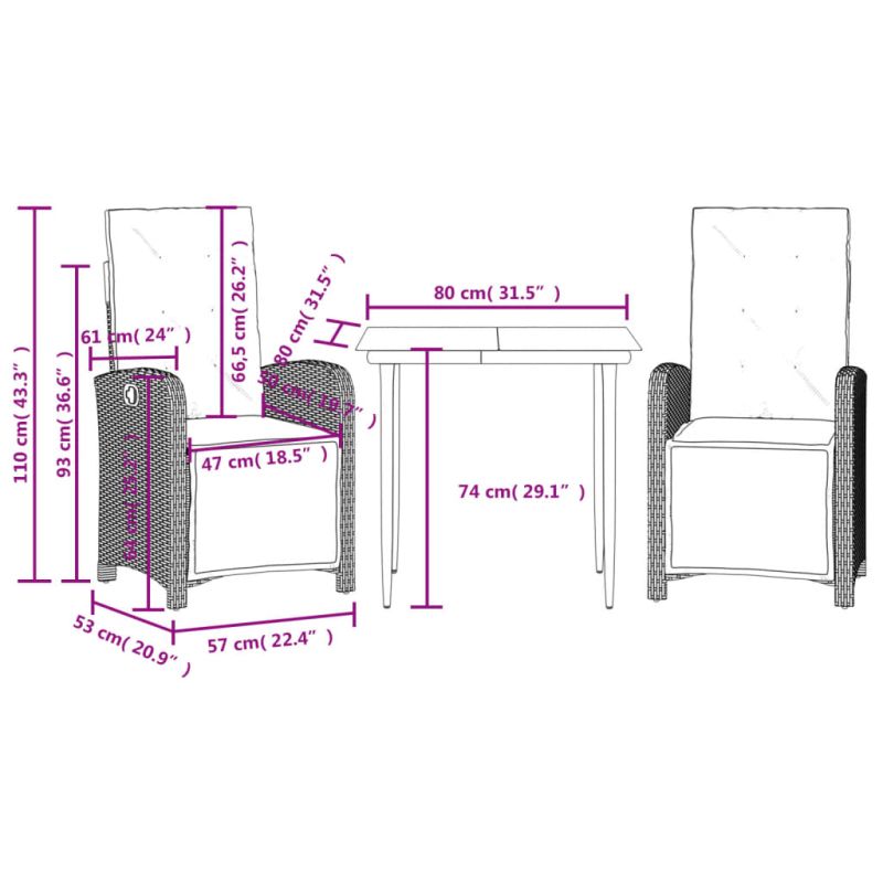Насладете се на чаша кафе или поговорете със семейството и приятелите си в градината, задния двор или на балкона с този удобен комплект за бистро! Издръжлив материал: PE ратан, известен също като полиратан, е здрав синтетичен материал с малко необходима поддръжка, който прилича на естествен ратан. Той е лек, лесен за почистване и често се използва за външни мебели поради своята издръжливост и устойчивост на атмосферни влияния.Регулируема облегалка и поставка за крака: Този градински стол има дръжка. Можете да регулирате облегалката и поставката за крака във всяка позиция чрез издърпване на дръжката и бързо да ги върнете в първоначалните им позиции.Удобна седалка: Тази мебел за открито, снабдена с плътно подплатени възглавници, предлага удобство при сядане.Калъф, който може да се сваля и може да се пере: Тези възглавници за седалки имат подвижни калъфи за лесно пране и поддръжка. Възглавниците за облегалките имат калъф отзад за лесно закрепване към облегалките.Стъклен плот: Плотът на външната маса е изработен от здраво и издръжливо закалено стъкло, което улеснява почистването с влажна кърпа и добавя нотка елегантност към вашето външно пространство. Добре е да се знае:За да сте сигурни, че вашите външни мебели ще останат красиви, ви препоръчваме да ги защитите с водоустойчиво покривало. Максимално 110 кг на седалка. Съобразете се с риска от открит огън и други източници на силна топлина в близост до продукта.