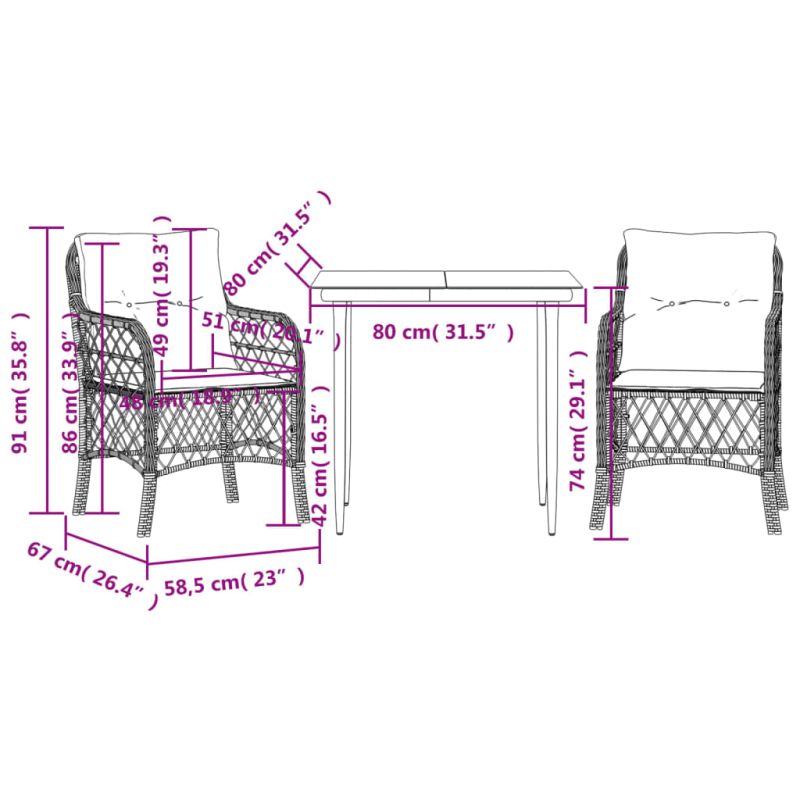 Насладете се на кафе или поговорете със семейството и приятелите си в градината, задния двор или на балкона с този удобен комплект за бистро! Издръжлив материал: PE ратан, известен също като полиратан, е здрав синтетичен материал с малко необходима поддръжка, който прилича на естествен ратан. Той е лек, лесен за почистване и често се използва за външни мебели поради своята издръжливост и устойчивост на атмосферни влияния.Удобна седалка: Този комплект мебели за открито, снабдени с плътно подплатени възглавници, предлага удобство при сядане.Калъф, който може да се сваля и може да се пере: Тези възглавници за седалки имат подвижни калъфи за лесно пране и поддръжка.Стъклен плот: Плотът на външната маса е изработен от здраво и издръжливо закалено стъкло, което улеснява почистването с влажна кърпа и добавя нотка елегантност към вашето външно пространство. Добре е да се знае:За да сте сигурни, че вашите външни мебели ще останат красиви, ви препоръчваме да ги защитите с водоустойчиво покривало.