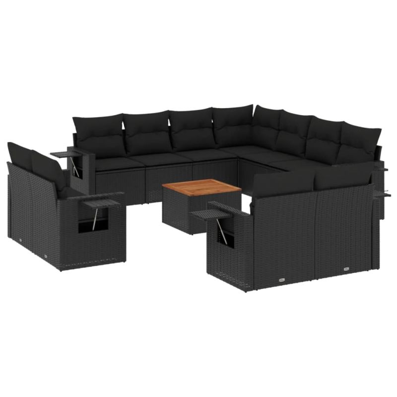Градински диван с възглавници, 12 части, черен, полиратан