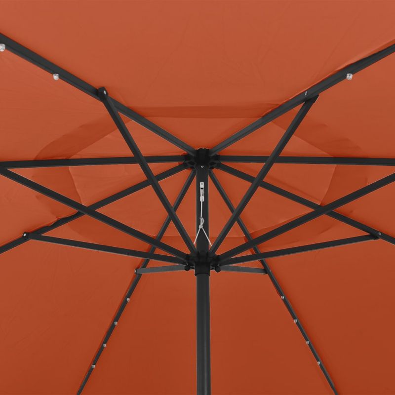 Този модерен градински чадър с LED осветление е отлично решение за създаване на сянка и предпазване от вредните UV лъчи. Този чадър е изработен от полиестер, който ви осигурява оптимална защита срещу слънчево изгаряне. Здравият метален стълб, заедно с твърдите ребра, поддържат чадъра стабилен и устойчив. Той е снабден с 32 светодиода за осветяване и създаване на уютна и романтична атмосфера през нощта. Освен това може лесно да се отваря и затваря благодарение на механизма с манивела.