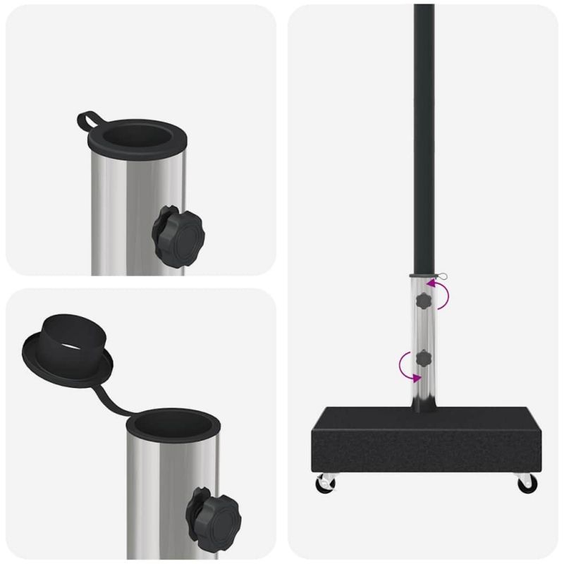 Тази основа за чадър осигурява здрава и стабилна основа за задържане на чадъра ви, както и за предпазването му от преобръщане или издухване. Държачът за чадър е с издръжлива гранитна конструкция, която е много стабилна благодарение на голямото си тегло. Гранитът също така има висококачествен вид и усещане, което придава на основата за чадър изтънчен външен вид, който ще добави докосване на елегантност към вашето външно жилищно пространство и ще допълни вашите луксозни градински мебели. Тръбата е изработена от неръждаема стомана. При това колелцата спомагат за лесното преместване на основата. Включените 2 адаптера са подходящи за чадъри с диаметър от 38 мм или 48 мм. Много е лесно да монтирате чадъра си към основата и да го държите здраво укрепен.
