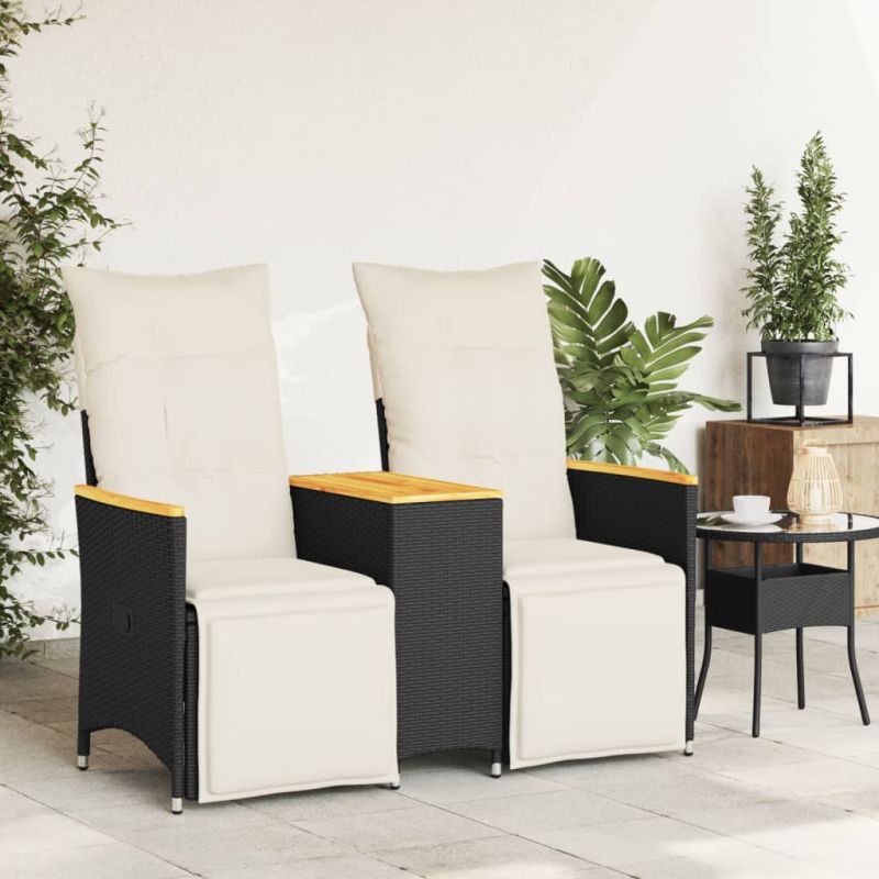 Накланящ се градински диван, 2-местен, с маса, черен, полиратан