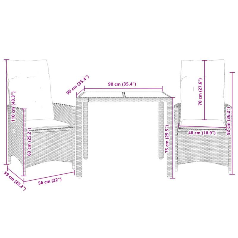 Насладете се на кафе или поговорете със семейството и приятелите си в градината, задния двор или на балкона с този удобен комплект за бистро! Издръжлив материал: PE ратан, известен също като полиратан, е здрав синтетичен материал с малко необходима поддръжка, който прилича на естествен ратан. Той е лек, лесен за почистване и често се използва за външни мебели поради своята издръжливост и устойчивост на атмосферни влияния.Регулируема облегалка: Този градински стол има дръжка. Можете да регулирате облегалката във всяка позиция чрез издърпване на дръжката и бързо да я върнете в първоначалната ѝ позиция.Стабилен и лесен за почистване плот: Тази градинска маса има плот от акациево дърво, който е здрав, издръжлив и лесен за почистване с влажна кърпа.Удобна седалка: Този комплект мебели за открито, снабдени с плътно подплатени възглавници, предлага удобство при сядане.Калъф, който може да се сваля и може да се пере: Тези възглавници за седалки имат подвижни калъфи за лесно пране и поддръжка. Възглавниците за облегалките имат калъф отзад за лесно закрепване към облегалките. Добре е да се знае:За да сте сигурни, че вашите външни мебели ще останат красиви, ви препоръчваме да ги защитите с водоустойчиво покривало.