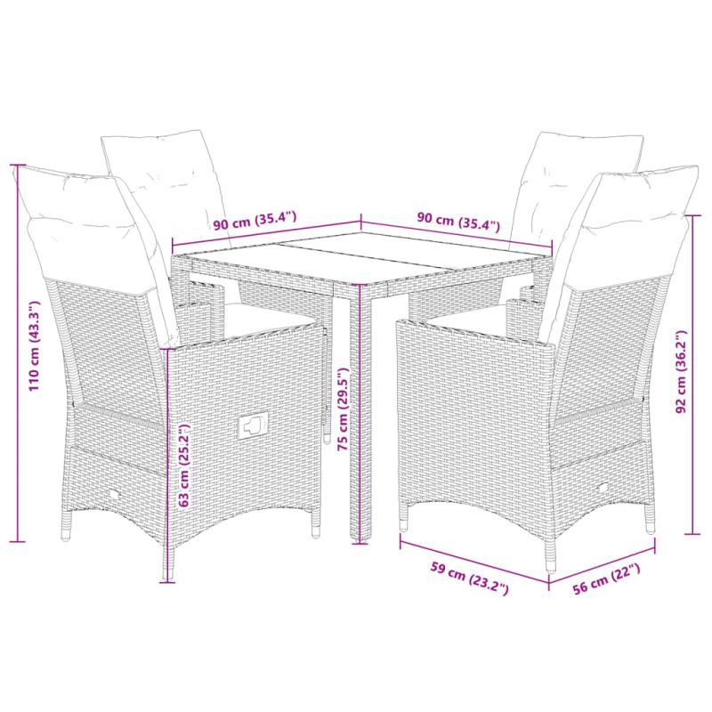Този градински трапезен комплект е чудесен избор за вечеря на открито или просто за почивка в градината, задния двор или във вътрешния двор. Издръжлив материал: PE ратан, известен също като полиратан, е здрав синтетичен материал с малко необходима поддръжка, който прилича на естествен ратан. Той е лек, лесен за почистване и често се използва за външни мебели поради своята издръжливост и устойчивост на атмосферни влияния.Регулируема облегалка: Този градински стол има дръжка. Можете да регулирате облегалката във всяка позиция чрез издърпване на дръжката и бързо да я върнете в първоначалната ѝ позиция.Стабилен и лесен за почистване плот: Тази градинска маса има плот от акациево дърво, който е здрав, издръжлив и лесен за почистване с влажна кърпа.Удобна седалка: Този комплект мебели за открито, снабдени с плътно подплатени възглавници, предлага удобство при сядане.Калъф, който може да се сваля и може да се пере: Тези възглавници за седалки имат подвижни калъфи за лесно пране и поддръжка. Възглавниците за облегалките имат калъф отзад за лесно закрепване към облегалките. Добре е да се знае:За да сте сигурни, че вашите външни мебели ще останат красиви, ви препоръчваме да ги защитите с водоустойчиво покривало.