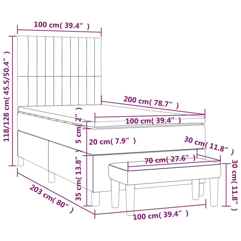 Използвайте това боксспринг легло, за да се насладите на спокоен сън! Предлага ви максимален релакс и приятен сън. Меко кадифе: Кадифето е мека и луксозна материя, която се отличава с гъста купчина равномерно отрязани влакна за гладка повърхност. Кадифената тъкан се отличава с меко усещане, което я прави приятна на допир.Практична табла за глава: Горната табла за легло се регулира на височина според вашите предпочитания. Горната част на леглото ви осигурява отлична опора за гърба, докато седите в леглото, за да четете или гледате телевизия.Покет пружинен матрак: Вградените индивидуални покет пружини са известни с много високото си качество, като същевременно осигуряват високо ниво на издръжливост и адаптивност. Те могат ефективно да абсорбират шума и ударите, причинени от мятане и въртене.Средно твърда поддръжка: Матракът за легло перфектно осигурява допълнителна стабилност и точното ниво на твърдост, без да се жертва комфорта. Така той е идеален за спящи по гръб или корем.Благоприятен за кожата топ матрак: Протекторът за матрак има издръжлива, както и щадяща кожата материя, което я прави мека и удобна.Многофункционална пейка: Тази пейка може да служи като допълнително място за сядане във вашия дом. Също така може да се използва като пейка в края на легло. Забележка:От хигиенни съображения матракът не може да бъде върнат, ако опаковката е отстранена или отворена.Всеки продукт се доставя с ръководство за сглобяване в кашона за лесно сглобяване.