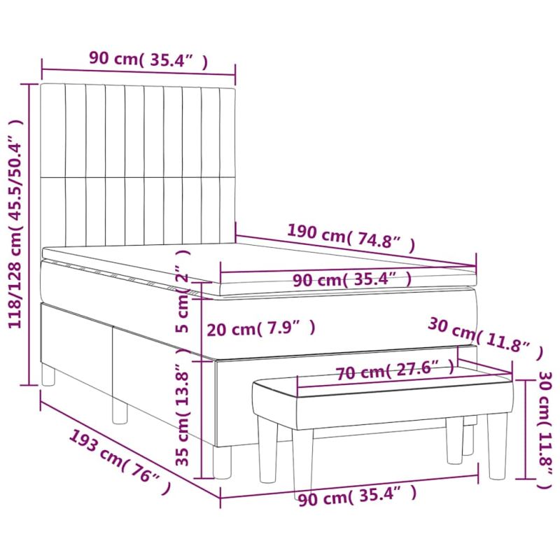 Използвайте това боксспринг легло, за да се насладите на спокоен сън! Предлага ви максимален релакс и приятен сън. Меко кадифе: Кадифето е мека и луксозна материя, която се отличава с гъста купчина равномерно отрязани влакна за гладка повърхност. Кадифената тъкан се отличава с меко усещане, което я прави приятна на допир.Практична табла за глава: Горната табла за легло се регулира на височина според вашите предпочитания. Горната част на леглото ви осигурява отлична опора за гърба, докато седите в леглото, за да четете или гледате телевизия.Покет пружинен матрак: Вградените индивидуални покет пружини са известни с много високото си качество, като същевременно осигуряват високо ниво на издръжливост и адаптивност. Те могат ефективно да абсорбират шума и ударите, причинени от мятане и въртене.Средно твърда поддръжка: Матракът за легло перфектно осигурява допълнителна стабилност и точното ниво на твърдост, без да се жертва комфорта. Така той е идеален за спящи по гръб или корем.Благоприятен за кожата топ матрак: Протекторът за матрак има издръжлива, както и щадяща кожата материя, което я прави мека и удобна.Многофункционална пейка: Тази пейка може да служи като допълнително място за сядане във вашия дом. Също така може да се използва като пейка в края на легло. Забележка:От хигиенни съображения матракът не може да бъде върнат, ако опаковката е отстранена или отворена.Всеки продукт се доставя с ръководство за сглобяване в кашона за лесно сглобяване.