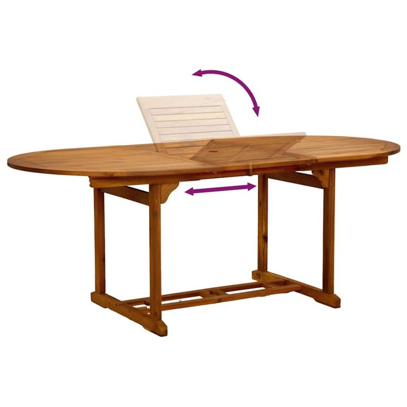 Насладете се на хубаво ястие на открито със семейството и приятелите си с този дървен градински трапезен комплект! Масивно акациево дърво: Външният трапезен комплект е изработен от масивно акациево дърво. Масивното акациево дърво е красив естествен материал. Акациевото дърво е тропическа твърда дървесина, която е плътна, здрава и издръжлива.Регулируема и сгъваема функция: Градинският стол може да се регулира в 5 позиции, така че винаги можете да намерите най-удобната позиция за сядане. Освен това може да се сгъва, за да се пести място, когато не се използва.Практичен дизайн: В плота на масата има отвор за чадър, за да можете лесно да прикрепите чадър и да създадете сенчесто място.Здрав плот: Тази градинска маса за хранене ви осигурява здрав плот. Можете да поставите леки закуски, напитки и всякакви любими декорации.Лесна за почистване повърхност: Покритата с масло повърхност прави тази градинска маса за хранене и столове лесни за почистване с влажна кърпа. Добре е да се знае:За да сте сигурни, че вашите външни мебели ще останат красиви, ви препоръчваме да ги защитите с водоустойчиво покривало.