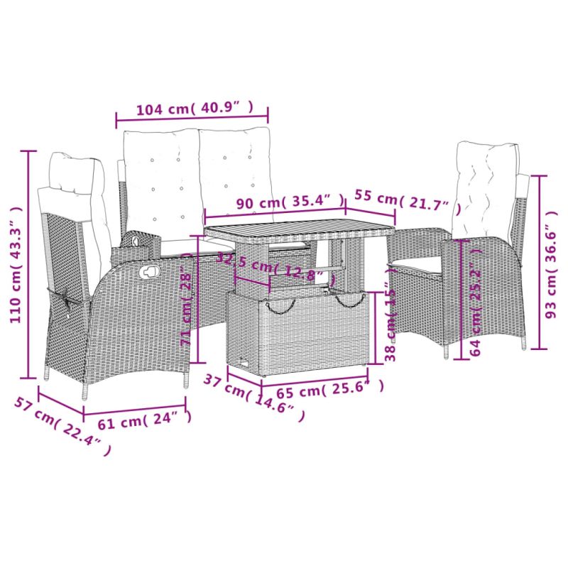 Този градински трапезен комплект е чудесен избор за вечеря на открито или просто за почивка в градината, задния двор или във вътрешния двор. Издръжлив материал: PE ратан, известен също като полиратан, е здрав синтетичен материал с малко необходима поддръжка, който прилича на естествен ратан. Той е лек, лесен за почистване и често се използва за външни мебели поради своята издръжливост и устойчивост на атмосферни влияния.Регулируема облегалка: Този градински стол има дръжка. Можете да регулирате облегалката във всяка позиция чрез издърпване на дръжката и бързо да я върнете в първоначалната ѝ позиция.Регулируем плот: Плотът може да се повдигне, за да направи масата по-висока, което трансформира външната маса от маса за кафе в маса за хранене. Идеална е за гости или за хранене навън.Калъф, който може да се сваля и може да се пере: Тези възглавници за седалки имат подвижни калъфи за лесно пране и поддръжка. Възглавниците за облегалките имат калъф отзад за лесно закрепване към облегалките.Удобна седалка: Тази мебел за открито, снабдена с плътно подплатени възглавници, предлага удобство при сядане. Добре е да се знае:За да сте сигурни, че вашите външни мебели ще останат красиви, ви препоръчваме да ги защитите с водоустойчиво покривало.