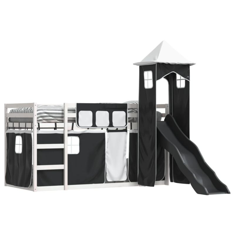 Двуетажно легло с пързалка и завеси, бяло и черно, 90x200 см