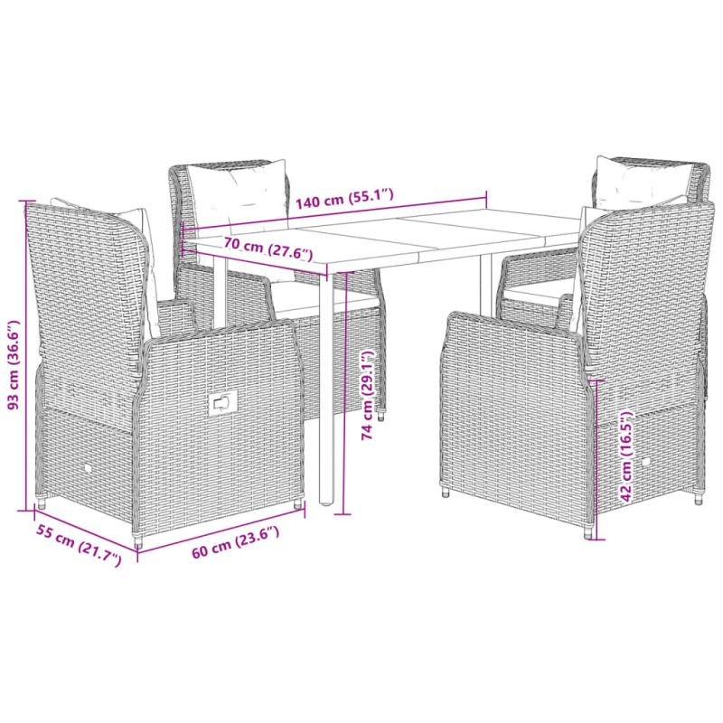 Този градински трапезен комплект е чудесен избор за вечеря на открито или просто за почивка в градината, задния двор или във вътрешния двор. Издръжлив материал: PE ратан, известен също като полиратан, е здрав синтетичен материал с малко необходима поддръжка, който прилича на естествен ратан. Той е лек, лесен за почистване и често се използва за външни мебели поради своята издръжливост и устойчивост на атмосферни влияния.Регулируема облегалка: Този градински стол има дръжка. Можете да регулирате облегалката във всяка позиция чрез издърпване на дръжката и бързо да я върнете в първоначалната ѝ позиция.Удобна седалка: Тази мебел за открито, снабдена с плътно подплатени възглавници, предлага удобство при сядане.Калъф, който може да се сваля и може да се пере: Възглавницата на седалката разполага с калъф, който може да се сваля за лесно пране и поддръжка.Стъклен плот: Плотът на външната маса е изработен от здраво и издръжливо закалено стъкло, което улеснява почистването с влажна кърпа и добавя нотка елегантност към вашето външно пространство. Добре е да се знае:За да сте сигурни, че вашите външни мебели ще останат красиви, ви препоръчваме да ги защитите с водоустойчиво покривало.