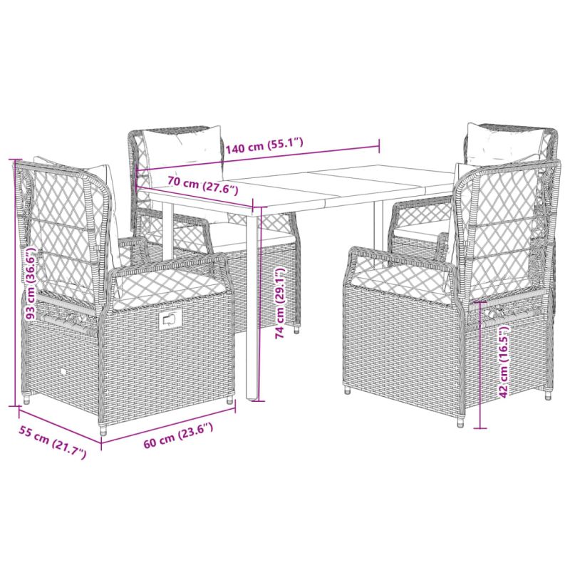 Този градински трапезен комплект е чудесен избор за вечеря на открито или просто за почивка в градината, задния двор или във вътрешния двор. Издръжлив материал: PE ратан, известен също като полиратан, е здрав синтетичен материал с малко необходима поддръжка, който прилича на естествен ратан. Той е лек, лесен за почистване и често се използва за външни мебели поради своята издръжливост и устойчивост на атмосферни влияния.Регулируема облегалка: Този градински стол има дръжка. Можете да регулирате облегалката във всяка позиция чрез издърпване на дръжката и бързо да я върнете в първоначалната ѝ позиция.Удобна седалка: Тази мебел за открито, снабдена с плътно подплатени възглавници, предлага удобство при сядане.Калъф, който може да се сваля и може да се пере: Възглавницата на седалката разполага с калъф, който може да се сваля за лесно пране и поддръжка.Стъклен плот: Плотът на външната маса е изработен от здраво и издръжливо закалено стъкло, което улеснява почистването с влажна кърпа и добавя нотка елегантност към вашето външно пространство. Добре е да се знае:За да сте сигурни, че вашите външни мебели ще останат красиви, ви препоръчваме да ги защитите с водоустойчиво покривало.