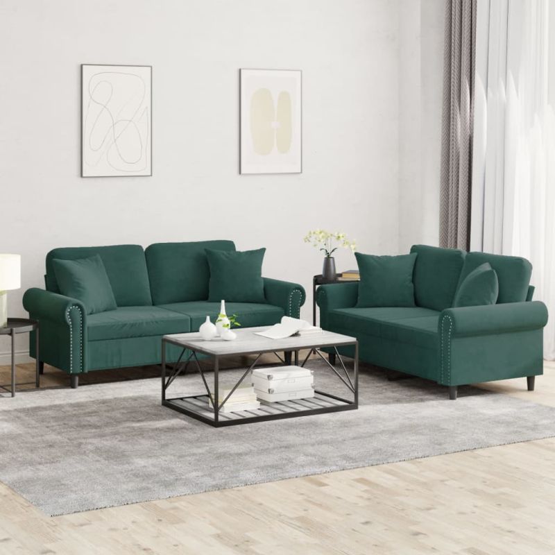 Комплект дивани 2 части с възглавници, тъмнозелен, кадифе