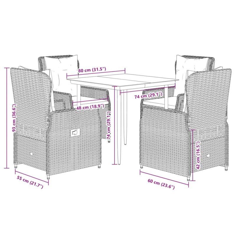 Този градински трапезен комплект е чудесен избор за вечеря на открито или просто за почивка в градината, задния двор или във вътрешния двор. Издръжлив материал: PE ратан, известен също като полиратан, е здрав синтетичен материал с малко необходима поддръжка, който прилича на естествен ратан. Той е лек, лесен за почистване и често се използва за външни мебели поради своята издръжливост и устойчивост на атмосферни влияния.Регулируема облегалка: Този градински стол има дръжка. Можете да регулирате облегалката във всяка позиция чрез издърпване на дръжката и бързо да я върнете в първоначалната ѝ позиция.Удобна седалка: Тази мебел за открито, снабдена с плътно подплатени възглавници, предлага удобство при сядане.Калъф, който може да се сваля и може да се пере: Възглавницата на седалката разполага с калъф, който може да се сваля за лесно пране и поддръжка.Стъклен плот: Плотът на външната маса е изработен от здраво и издръжливо закалено стъкло, което улеснява почистването с влажна кърпа и добавя нотка елегантност към вашето външно пространство. Добре е да се знае:За да сте сигурни, че вашите външни мебели ще останат красиви, ви препоръчваме да ги защитите с водоустойчиво покривало.