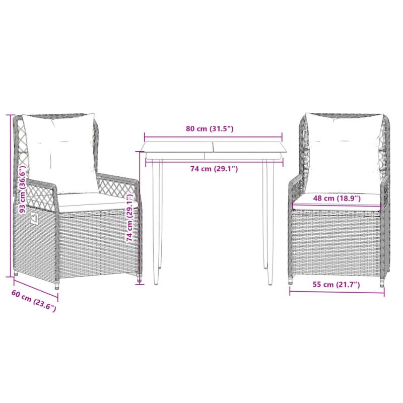 Този градински трапезен комплект е чудесен избор за вечеря на открито или просто за почивка в градината, задния двор или във вътрешния двор. Издръжлив материал: PE ратан, известен също като полиратан, е здрав синтетичен материал с малко необходима поддръжка, който прилича на естествен ратан. Той е лек, лесен за почистване и често се използва за външни мебели поради своята издръжливост и устойчивост на атмосферни влияния.Регулируема облегалка: Този градински стол има дръжка. Можете да регулирате облегалката във всяка позиция чрез издърпване на дръжката и бързо да я върнете в първоначалната ѝ позиция.Удобна седалка: Тази мебел за открито, снабдена с плътно подплатени възглавници, предлага удобство при сядане.Калъф, който може да се сваля и може да се пере: Възглавницата на седалката разполага с калъф, който може да се сваля за лесно пране и поддръжка.Стъклен плот: Плотът на външната маса е изработен от здраво и издръжливо закалено стъкло, което улеснява почистването с влажна кърпа и добавя нотка елегантност към вашето външно пространство. Добре е да се знае:За да сте сигурни, че вашите външни мебели ще останат красиви, ви препоръчваме да ги защитите с водоустойчиво покривало.
