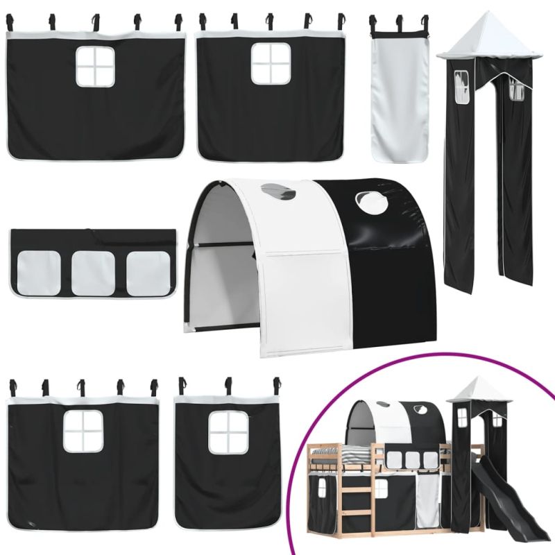 Двуетажно легло с пързалка и завеси, бяло и черно, 90x200 см