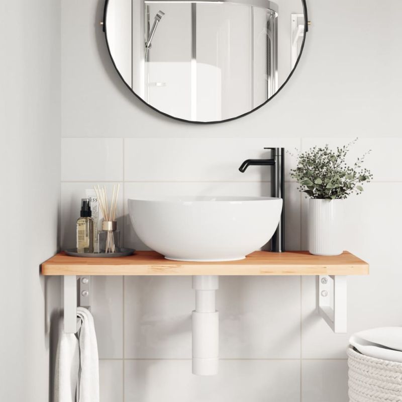 Стенният рафт за мивка се прикрепя сигурно към стената, осигурявайки елегантно и спестяващо място решение за вашата баня. Здрав и дълготраен: Този рафт за мивка е комбиниран със стоманена конструкция и плот от масивна букова дървесина, което го прави здрав, стабилен и дълготраен. Спестяване на място: Плаващият рафт за мивка има достатъчно място за съхранение на кремове и дребни предмети. Благодарение на правоъгълната форма можете да закачите кърпи или други неща на опората, за да спестите място. Лесен за използване: Плотът се доставя без дупки, за да позволи на мивката да се монтира отляво, отдясно или в центъра, в зависимост от изискванията на вашето помещение. Благодарение на предварително пробитите отвори в държача, той може лесно да се сглоби с плота и да се монтира на стената. Широки приложения: Благодарение на модерния си дизайн, осигурява допълнително пространство за различни видове бани. Добре е да се знае:Винтовете не са включени, можете да закупите винтовете отделно въз основа на информацията, предоставена по-долу. Прикрепване към стена: 2 бр дюбели M8 на скоба Дървен плот: 2 бр M5x18 винта (T=2) или 2 бр M5x20 винта (T=2,5/4 см) на скоба