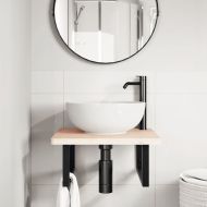 Стенният рафт за мивка се прикрепя сигурно към стената, осигурявайки елегантно и спестяващо място решение за вашата баня. Здрав и дълготраен: Този рафт за мивка е комбиниран със стоманена конструкция и плот от масивна букова дървесина, което го прави здрав, стабилен и дълготраен. Спестяване на място: Плаващият рафт за мивка има достатъчно място за съхранение на кремове и дребни предмети. Благодарение на правоъгълната форма можете да закачите кърпи или други неща на опората, за да спестите място. Лесен за използване: Плотът се доставя без дупки, за да позволи на мивката да се монтира отляво, отдясно или в центъра, в зависимост от изискванията на вашето помещение. Благодарение на предварително пробитите отвори в държача, той може лесно да се сглоби с плота и да се монтира на стената. Широки приложения: Благодарение на модерния си дизайн, осигурява допълнително пространство за различни видове бани. Добре е да се знае:Винтовете не са включени, можете да закупите винтовете отделно въз основа на информацията, предоставена по-долу. Прикрепване към стена: 2 бр дюбели M8 на скоба Дървен плот: 2 бр M5x18 винта (T=2) или 2 бр M5x20 винта (T=2,5/4 см) на скоба