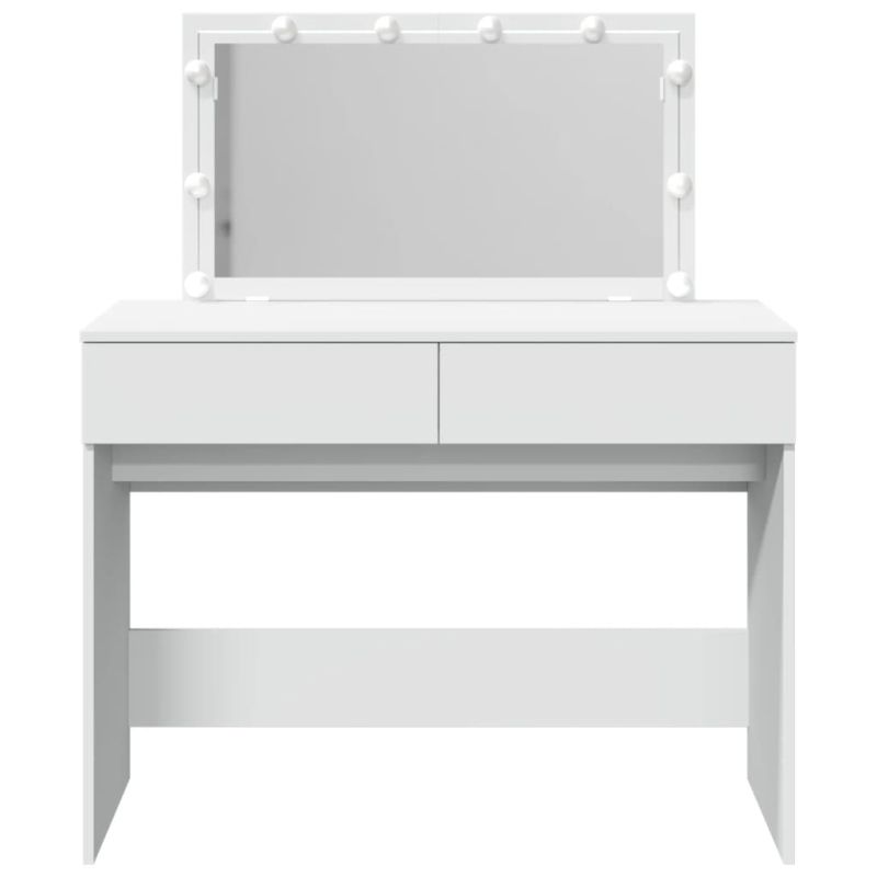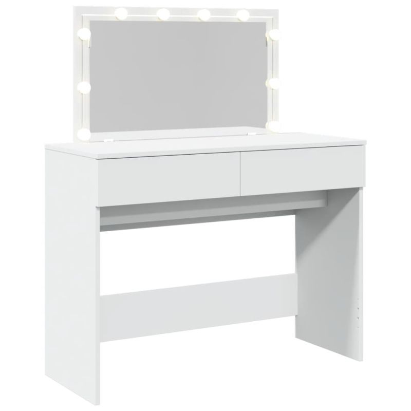 Тоалетката е страхотно допълнение към декора на вашата спалня, като същевременно държи козметиката ви подръка! Стабилен и издръжлив материал: Инженерната дървесина е издръжлив и стабилен материал с гладка повърхност, която е устойчива на влага, изкривяване и разцепване, което я прави надежден избор за различни проекти.Достатъчно място за съхранение: Масичката за гримиране с 2 чекмеджета предлага достатъчно място за съхранение, за да държите вашите различни ежедневни неща добре организирани и леснодостъпни.Помощно огледало: Включеното красиво огледало осигурява ясна видимост за нанасяне на грим и добавя елегантен щрих към тоалетката.LED осветление: Козметичната масичка разполага с LED крушки с USB, които лесно превключват режимите от топло към студено бяло. Включените светодиоди около огледалото също така озаряват вашата красота. Внимание:За да предотвратите преобръщане, този продукт трябва да се използва с предоставеното устройство за закрепване на стена.