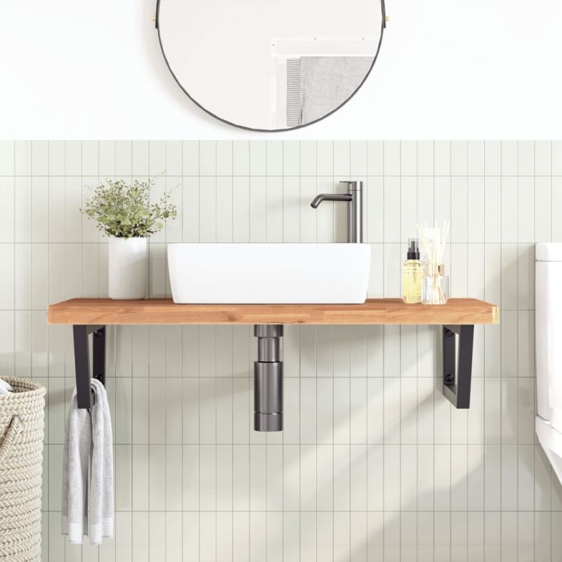 Стенният рафт за мивка се прикрепя сигурно към стената, осигурявайки елегантно и спестяващо място решение за вашата баня. Здрав и дълготраен: Този рафт за мивка е комбиниран със стоманена конструкция и плот от масивна букова дървесина, което го прави здрав, стабилен и дълготраен. Спестяване на място: Плаващият рафт за мивка има достатъчно място за съхранение на кремове и дребни предмети. Благодарение на трапецовидната форма можете да закачите кърпи или други неща на опората, за да спестите място. Лесен за използване: Плотът се доставя без дупки, за да позволи на мивката да се монтира отляво, отдясно или в центъра, в зависимост от изискванията на вашето помещение. Благодарение на предварително пробитите отвори в държача, той може лесно да се сглоби с плота и да се монтира на стената. Широки приложения: Благодарение на модерния си дизайн, осигурява допълнително пространство за различни видове бани. Добре е да се знае:Винтовете не са включени, можете да закупите винтовете отделно въз основа на информацията, предоставена по-долу. Прикрепване към стена: 2 бр дюбели M8 на скоба Дървен плот: 2 бр M5x18 винта (T=2) или 2 бр M5x20 винта (T=2,5/4 см) на скоба