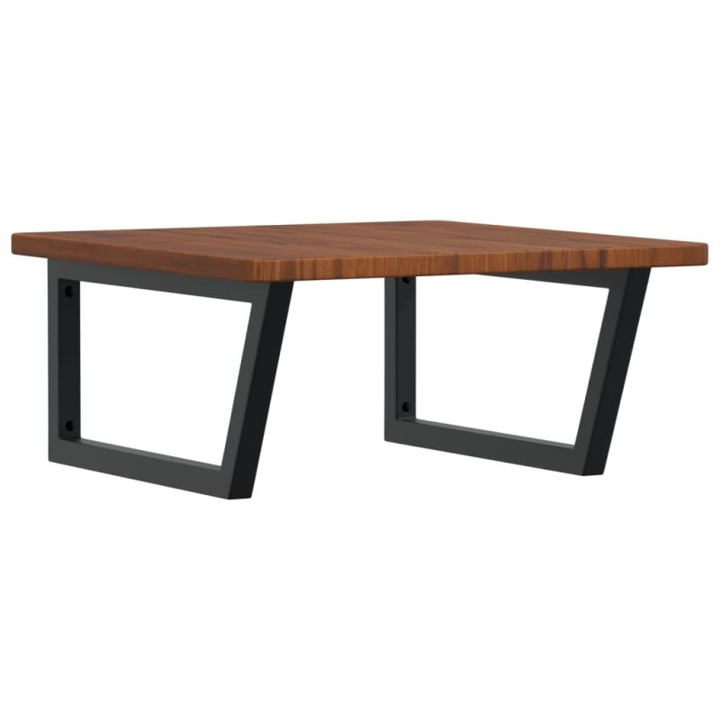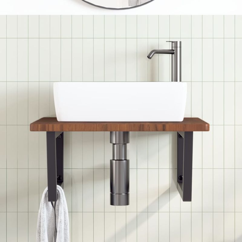 Стенният рафт за мивка се прикрепя сигурно към стената, осигурявайки елегантно и спестяващо място решение за вашата баня. Здрав и дълготраен: Този рафт за мивка е комбиниран със стоманена конструкция и плот от масивна дъбова дървесина, което го прави здрав, стабилен и дълготраен. Спестяване на място: Плаващият рафт за мивка има достатъчно място за съхранение на кремове и дребни предмети. Благодарение на трапецовидната форма можете да закачите кърпи или други неща на опората, за да спестите място. Лесен за използване: Плотът се доставя без дупки, за да позволи на мивката да се монтира отляво, отдясно или в центъра, в зависимост от изискванията на вашето помещение. Благодарение на предварително пробитите отвори в държача, той може лесно да се сглоби с плота и да се монтира на стената. Широки приложения: Благодарение на модерния си дизайн, осигурява допълнително пространство за различни видове бани. Добре е да се знае:Винтовете не са включени, можете да закупите винтовете отделно въз основа на информацията, предоставена по-долу. Прикрепване към стена: 2 бр дюбели M8 на скоба Дървен плот: 2 бр M5x18 винта (T=2) или 2 бр M5x20 винта (T=2,5/4 см) на скоба