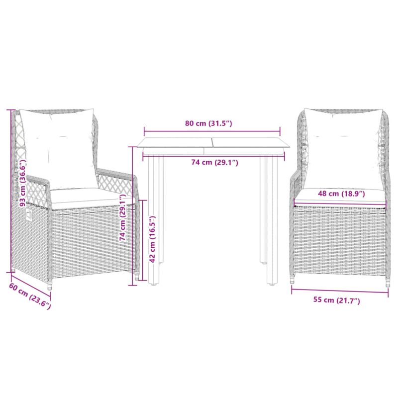 Този градински трапезен комплект е чудесен избор за вечеря на открито или просто за почивка в градината, задния двор или във вътрешния двор. Издръжлив материал: PE ратан, известен също като полиратан, е здрав синтетичен материал с малко необходима поддръжка, който прилича на естествен ратан. Той е лек, лесен за почистване и често се използва за външни мебели поради своята издръжливост и устойчивост на атмосферни влияния.Регулируема облегалка: Този градински стол има дръжка. Можете да регулирате облегалката във всяка позиция чрез издърпване на дръжката и бързо да я върнете в първоначалната ѝ позиция.Удобна седалка: Тази мебел за открито, снабдена с плътно подплатени възглавници, предлага удобство при сядане.Калъф, който може да се сваля и може да се пере: Възглавницата на седалката разполага с калъф, който може да се сваля за лесно пране и поддръжка.Стъклен плот: Плотът на външната маса е изработен от здраво и издръжливо закалено стъкло, което улеснява почистването с влажна кърпа и добавя нотка елегантност към вашето външно пространство. Добре е да се знае:За да сте сигурни, че вашите външни мебели ще останат красиви, ви препоръчваме да ги защитите с водоустойчиво покривало. Максимално 110 кг на седалка. Съобразете се с риска от открит огън и други източници на силна топлина в близост до продукта.