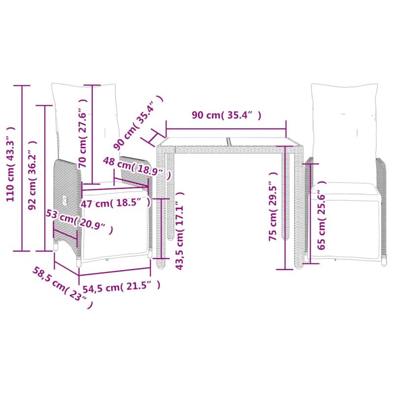 Насладете се на кафе или поговорете със семейството и приятелите си в градината, задния двор или на балкона с този удобен комплект за бистро! Издръжлив материал: PE ратан, известен също като полиратан, е здрав синтетичен материал с малко необходима поддръжка, който прилича на естествен ратан. Той е лек, лесен за почистване и често се използва за външни мебели поради своята издръжливост и устойчивост на атмосферни влияния.Регулируема облегалка и поставка за крака: Този градински стол има дръжка. Можете да регулирате облегалката и поставката за крака във всяка позиция чрез издърпване на дръжката и бързо да ги върнете в първоначалната им позиция.Удобна седалка: Тази мебел за открито, снабдена с плътно подплатени възглавници, предлага удобство при сядане.Калъф, който може да се сваля и може да се пере: Тези възглавници за седалки имат подвижни калъфи за лесно пране и поддръжка. Възглавниците за облегалките имат калъф отзад за лесно закрепване към облегалките.Стъклен плот: Плотът на външната маса е изработен от здраво и издръжливо закалено стъкло, което улеснява почистването с влажна кърпа и добавя нотка елегантност към вашето външно пространство. Добре е да се знае:За да сте сигурни, че вашите външни мебели ще останат красиви, ви препоръчваме да ги защитите с водоустойчиво покривало.