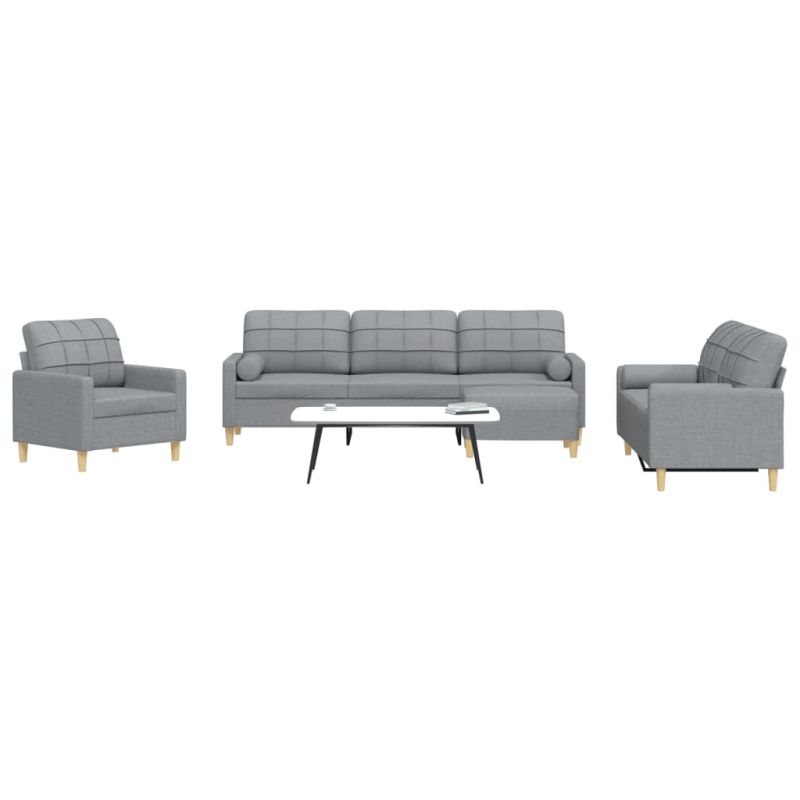 Този комплект дивани е отлично място за вашето време за разговори, четене, гледане на телевизия или просто почивка. Той е предназначен да бъде фокусна точка във вашия дом. Мек и издръжлив материал: Полиестерната тъкан предлага комбинация от мекота, дишане и издръжливост, гарантирайки ви да изпитате максимален комфорт и уют. Здрава и стабилна рамка: Металната рамка на тапицирания диван осигуряват здравина и стабилност. Удобна седалка: Диванът е много удобен с дебело подплатените седалки, подлакътниците и възглавниците за гърба. Практични ролкови възглавници: Тези цилиндрични възглавници не само освежават интериора, но и добавят допълнителен комфорт, докато седите или лежите. Функционална табуретка: Тази табуретка е подходяща за опора за крака, когато лежите на диван, или ви предлага допълнително място за сядане във вашата стая. Освен това семплият дизайн и компактният размер я правят идеална за сядане почти навсякъде в жилищното ви пространство.