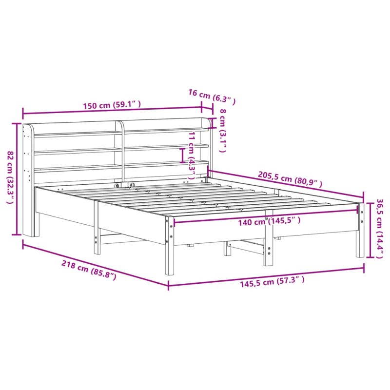 Осигурете си по-добър спокоен нощен сън с тази рамка за легло! Тя представлява приветливо допълнение към всяка спалня. Стабилна и дълготрайна рамка: Масивната борова дървесина е известна със своята здравина и издръжливост. Нейните прави зърна и отличителни възли допринасят за рустик чара ѝ.Решетъчна основа за оптимална опора: Рамката на леглото е оборудвана с решетъчна основа за опора и дишане на вашия матрак.Гъвкава табла: Тази рамка за легло се предлага с табла, която осигурява отлична опора за гърба, когато седите в леглото, за да четете или гледате телевизия, като същевременно служи и като декоративен елемент.Достатъчно място за съхранение: Тази елегантна табла разполага с три удобни рафта, предлагащи достатъчно място за съхранение, за да държите всичките си основни вещи през нощта леснодостъпни. Добре е да се знае:Към това легло не е включен матрак. Ние предлагаме разнообразна селекция от матраци. Можете да проверите нашия магазин за подходящ матрак.