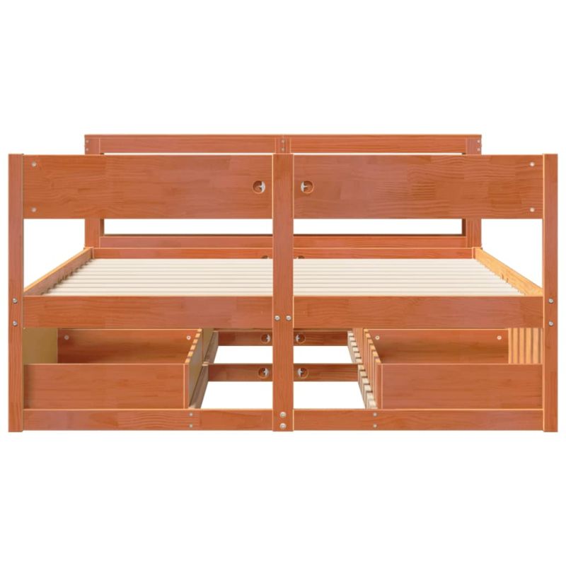 Осигурете си по-добър спокоен нощен сън с тази рамка за легло! Тя представлява приветливо допълнение към всяка спалня. Стабилна и дълготрайна рамка: Масивната борова дървесина е известна със своята здравина и издръжливост. Нейните прави зърна и отличителни възли допринасят за рустик чара ѝ.Решетъчна основа за оптимална опора: Рамката на леглото е оборудвана с решетъчна основа за опора и дишане на вашия матрак.Използвайте пълноценно пространството: Тази рамка за легло разполага с четири чекмеджета отдолу, осигуряващи съхранение на предмети като допълнително спално бельо, сезонни дрехи и играчки.Достатъчно място за съхранение: Тази елегантна табла на леглото разполага с два удобни рафта, предлагащи достатъчно място за съхранение, за да държите всичките си основни вещи през нощта леснодостъпни.Свободностояща табла: Свободностоящата табла предлага безпроблемно решение за лесно поставяне и препозициониране без необходимост от монтаж на стена. Добре е да се знае:Към това легло не е включен матрак. Ние предлагаме разнообразна селекция от матраци. Можете да проверите нашия магазин за подходящ матрак.