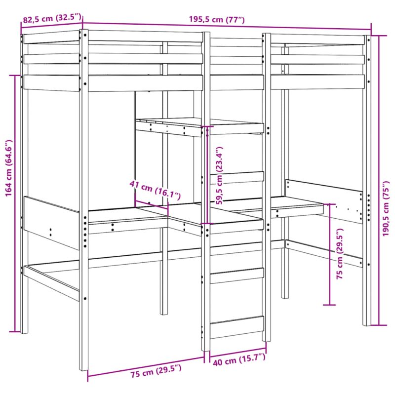 Това универсално таванско легло обединява единично легло с бюра и рафтове, осигурявайки уютно място за спане, просторна работна зона и ефективно решение за съхранение. То е идеален избор за жилища с ограничено пространство. Стабилна и дълготрайна рамка: Масивната борова дървесина е известна със своята здравина и издръжливост. Нейните прави зърна и отличителни възли допринасят за рустик чара ѝ. Максимално оползотворяване на пространството: Тази рамка за легло разполага с две бюра и два рафта отдолу, като ефективно използва пространството под леглото, за да осигури достатъчно място за съхранение на ежедневни вещи, като същевременно създава уютно пространство за работа и учене. То е идеален избор за по-малки или по-ограничени площи. Лесно изкачване нагоре и надолу: Тази рамка за легло разполага с вградена стълба, осигуряваща удобен достъп за потребителите да се катерят нагоре и надолу. Парапети за повишена безопасност: Тази рамка за легло е оборудвана с парапети, за да ви предпази от падане от леглото, докато спите. Решетъчна основа за оптимална опора: Рамката на леглото е оборудвана с решетъчна основа за опора и дишане на вашия матрак. Внимание: За да предотвратите преобръщане, този продукт трябва да се използва с предоставеното устройство за закрепване на стена. Добре е да се знае: Към това легло не е включен матрак. Ние предлагаме разнообразна селекция от матраци. Можете да проверите нашия магазин за подходящ матрак. Винтовете и дюбелите за стената не са включени. Съветваме ви да намерите и използвате винтове и дюбели, подходящи специално за вашите стени. Ако не сте сигурни, можете да се консултирате с професионалист. Моля, прочетете и следвайте всяка стъпка от инструкциите.