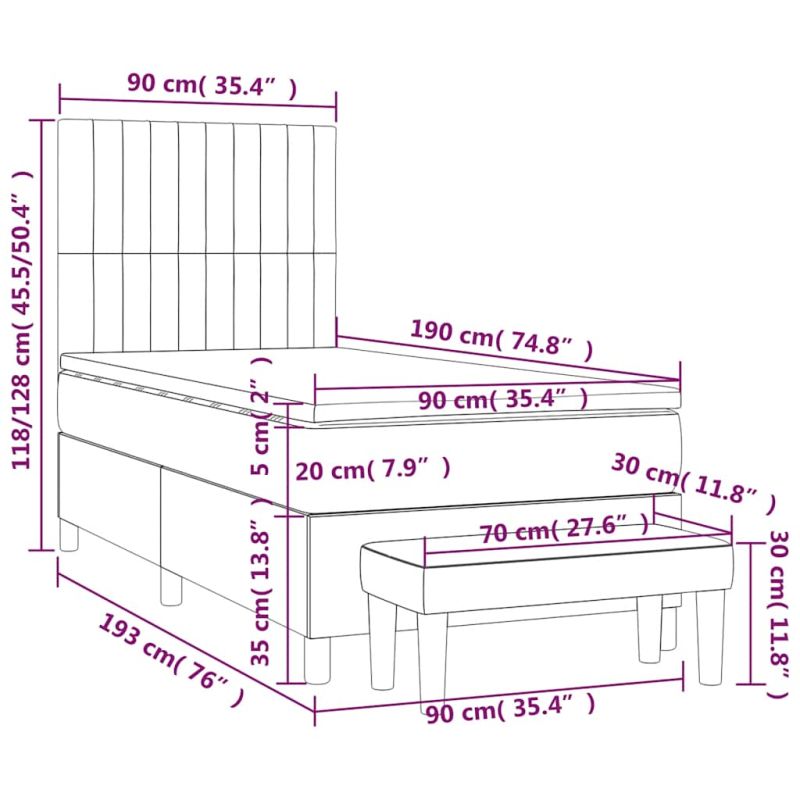 Използвайте това боксспринг легло, за да се насладите на спокоен сън! Предлага ви максимален релакс и приятен сън. Меко кадифе: Кадифето е мека и луксозна материя, която се отличава с гъста купчина равномерно отрязани влакна за гладка повърхност. Кадифената тъкан се отличава с меко усещане, което я прави приятна на допир.Практична табла за глава: Горната табла за легло се регулира на височина според вашите предпочитания. Горната част на леглото ви осигурява отлична опора за гърба, докато седите в леглото, за да четете или гледате телевизия.Покет пружинен матрак: Вградените индивидуални покет пружини са известни с много високото си качество, като същевременно осигуряват високо ниво на издръжливост и адаптивност. Те могат ефективно да абсорбират шума и ударите, причинени от мятане и въртене.Средно твърда поддръжка: Матракът за легло перфектно осигурява допълнителна стабилност и точното ниво на твърдост, без да се жертва комфорта. Така той е идеален за спящи по гръб или корем.Благоприятен за кожата топ матрак: Протекторът за матрак има издръжлива, както и щадяща кожата материя, което я прави мека и удобна.Многофункционална пейка: Тази пейка може да служи като допълнително място за сядане във вашия дом. Също така може да се използва като пейка в края на легло. Забележка:От хигиенни съображения матракът не може да бъде върнат, ако опаковката е отстранена или отворена.Всеки продукт се доставя с ръководство за сглобяване в кашона за лесно сглобяване.