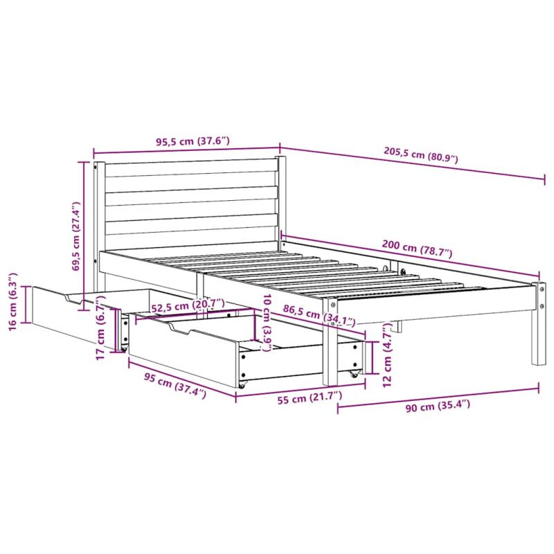Осигурете си по-добър спокоен нощен сън с тази рамка за легло! Тя представлява приветливо допълнение към всяка спалня. Стабилна и дълготрайна рамка: Масивната борова дървесина е известна със своята здравина и издръжливост. Нейните прави зърна и отличителни възли допринасят за рустик чара ѝ.Решетъчна основа за оптимална опора: Рамката на леглото е оборудвана с решетъчна основа за опора и дишане на вашия матрак.Използвайте пълноценно пространството: Тази рамка за легло разполага с две чекмеджета отдолу, осигуряващи съхранение на предмети като допълнително спално бельо, сезонни дрехи и играчки.Маневреност без усилие: Това чекмедже за съхранение под леглото разполага с четири колелца, осигуряващи плавна и лесна маневреност за плъзгане и изваждане под леглото ви. Добре е да се знае:Към това легло не е включен матрак. Ние предлагаме разнообразна селекция от матраци. Можете да проверите нашия магазин за подходящ матрак.